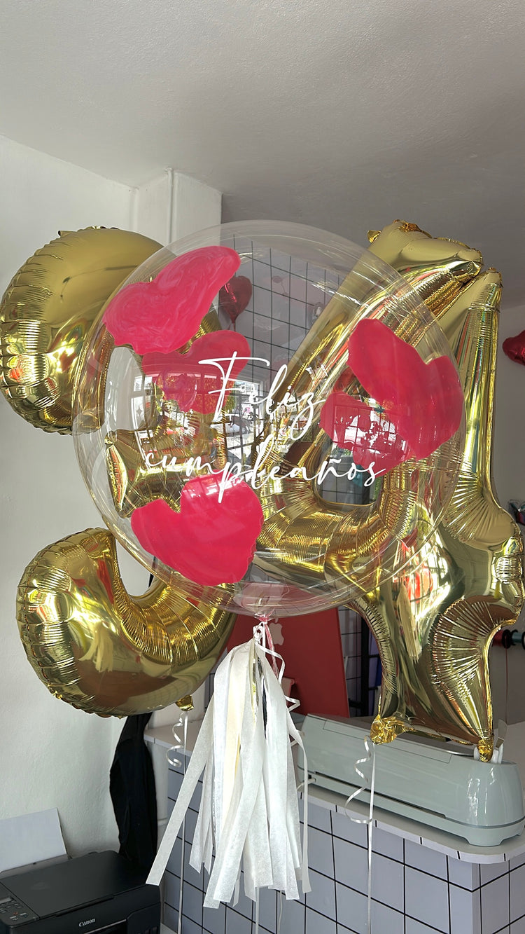 - Globo burbuja transparente pintado con corazones por dentro. Favor de especificar en las indicaciones especiales la gama de color y el texto de su elección.