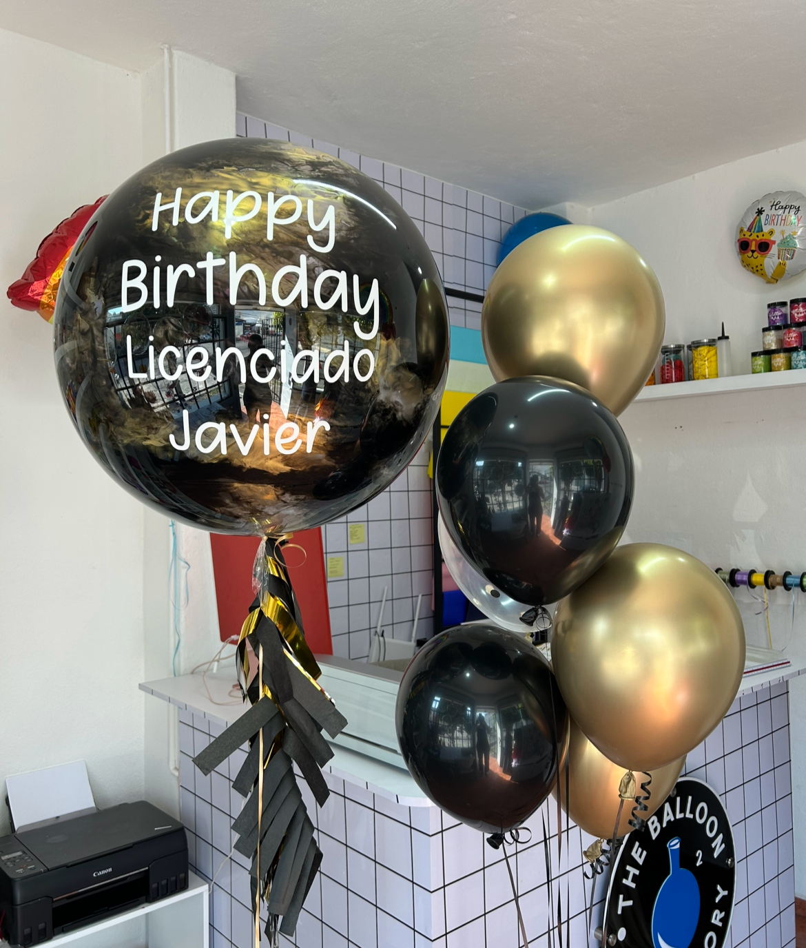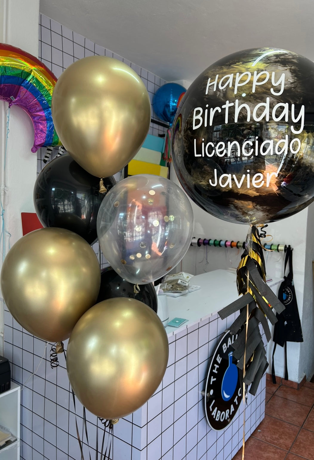 - Globo burbuja transparente pintado por completo + 5 globos de látex lisos + 1 globo látex transparente con confetti. Favor de especificar en las indicaciones especiales la gama de color y texto de su elección.