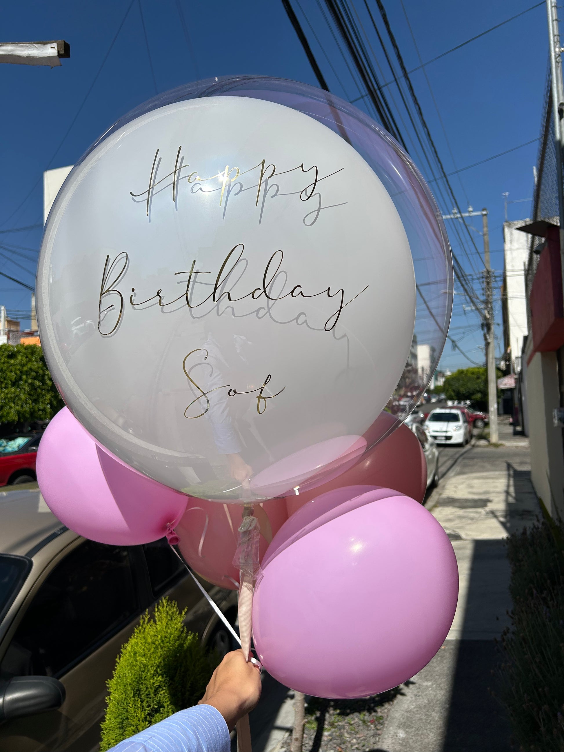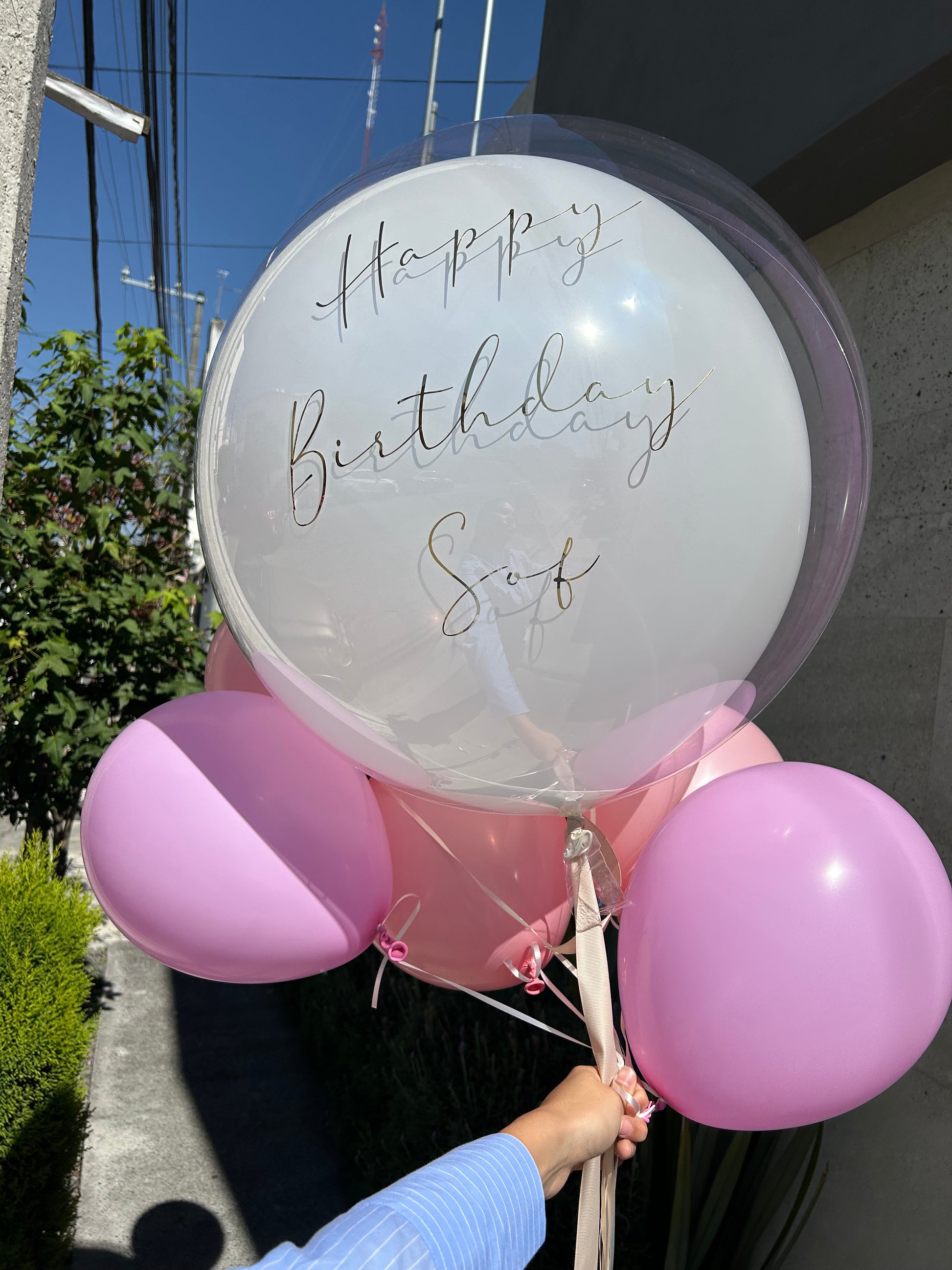 - Globo burbuja transparente con globo de látex 24" + 6 globo látex. Favor de especificar en las indicaciones especiales el color del globo de látex 24" y el texto de su elección.