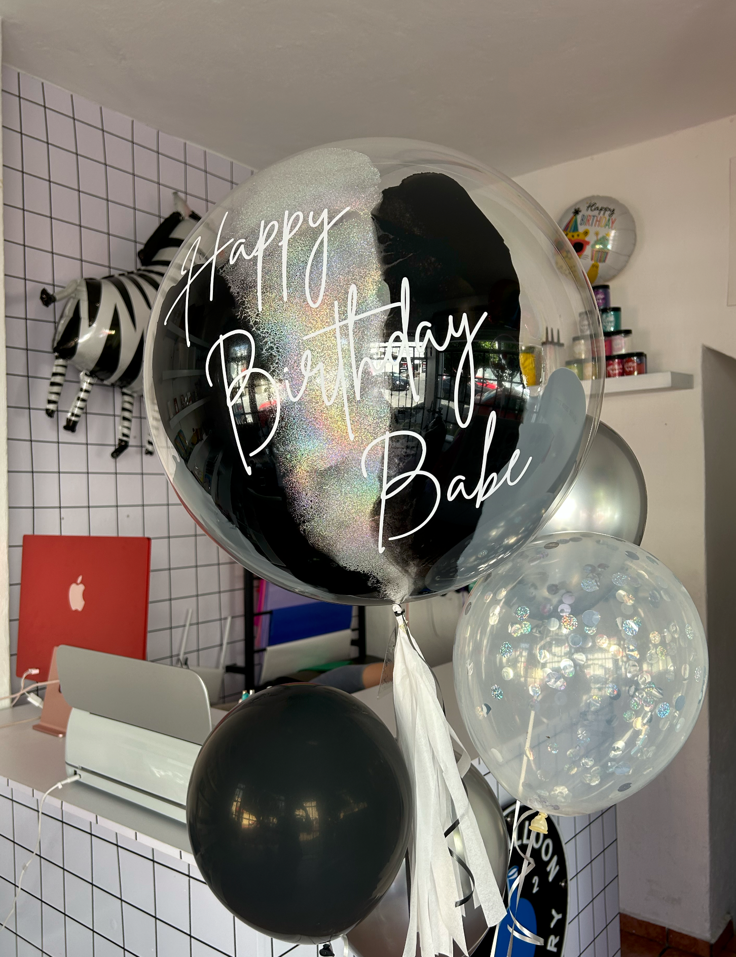 - Globo burbuja transparente pintado por dentro con tiras de colores de pintura y glitter plateado + 3 globos de látex lisos + 1 globo látex transparente con confetti. Favor de especificar en las indicaciones especiales la gama de color y el texto de su elección.