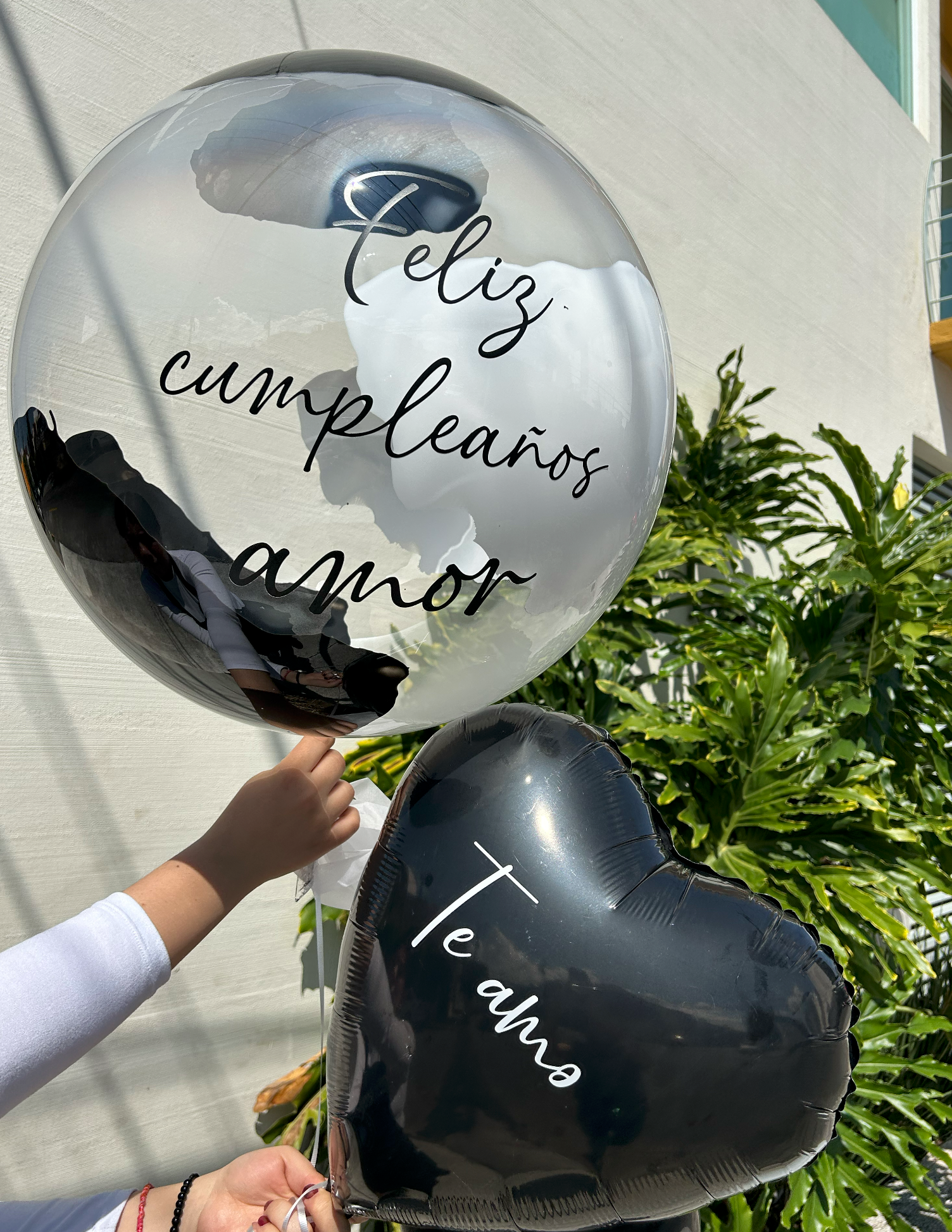 - Globo burbuja transparente pintado en forma de manchas + 1 corazón con texto + 2 globos de látex lisos. Favor de especificar en las indicaciones especiales la gama de color de su elección.