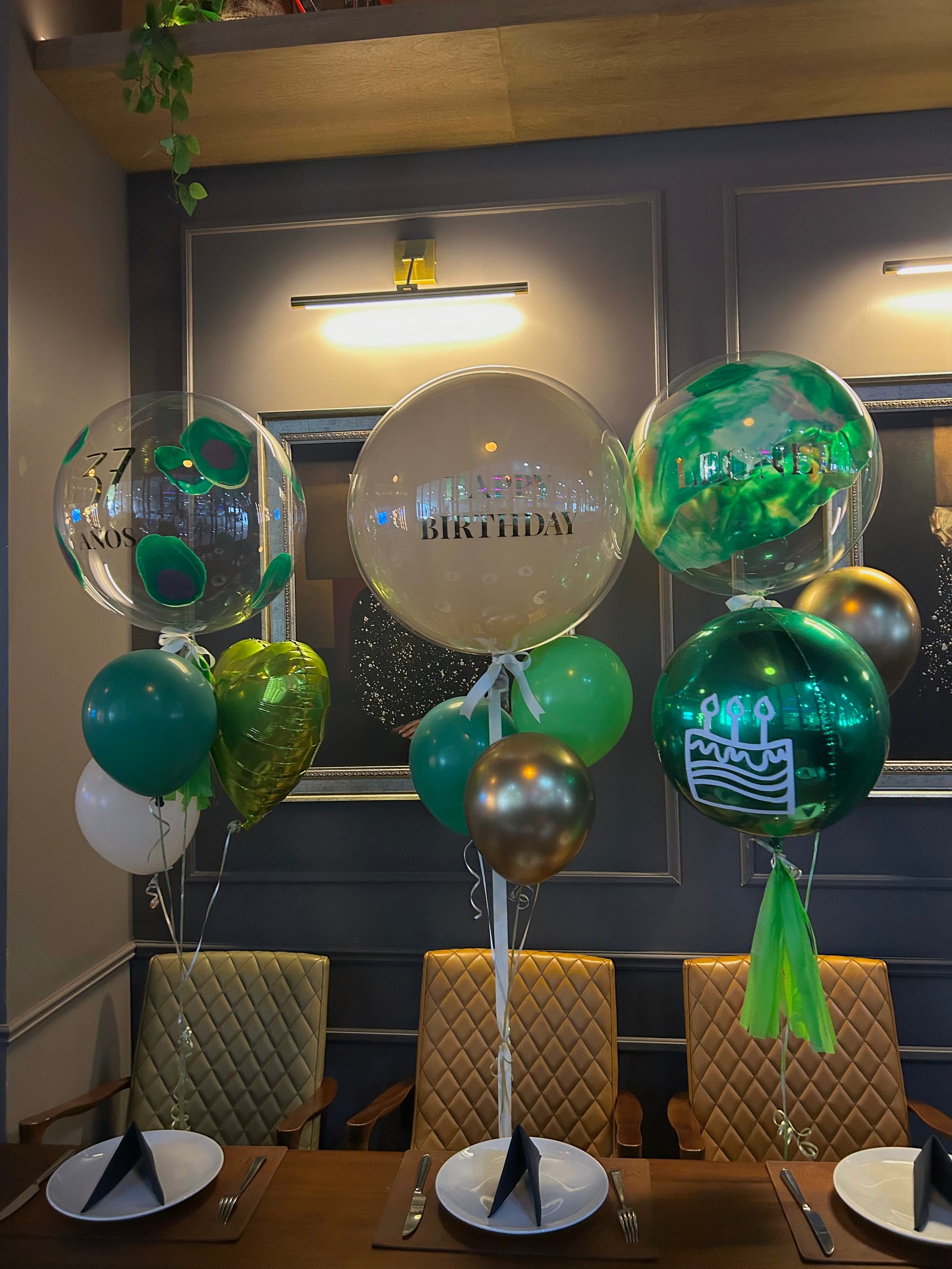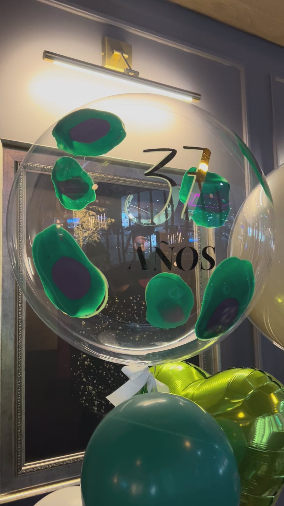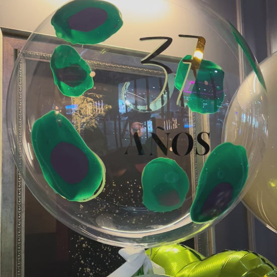 - 1 Globo burbuja grande transparente con globo látex 24" + 1 globo burbuja mediano marmoleado + 1 globo burbuja mediano con figuras por dentro + 1 orbz + 1 corazón + 6 globo látex. Favor de especificar en las indicaciones especiales el texto de su elección.