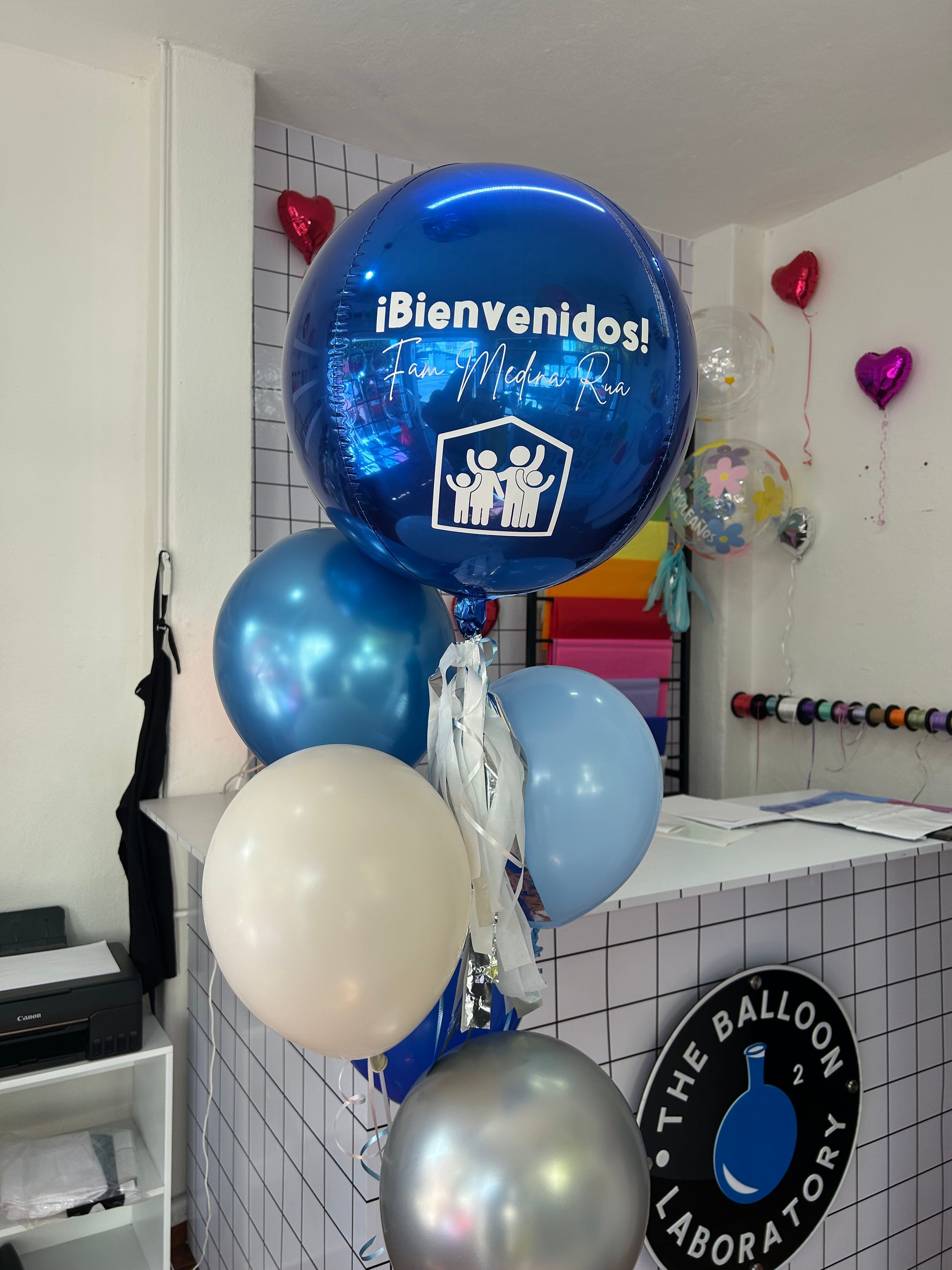 - Orbz esfera metálica + 5 globos látex 12". Favor de especificar en las indicaciones especiales la gama de color y el texto de su elección.