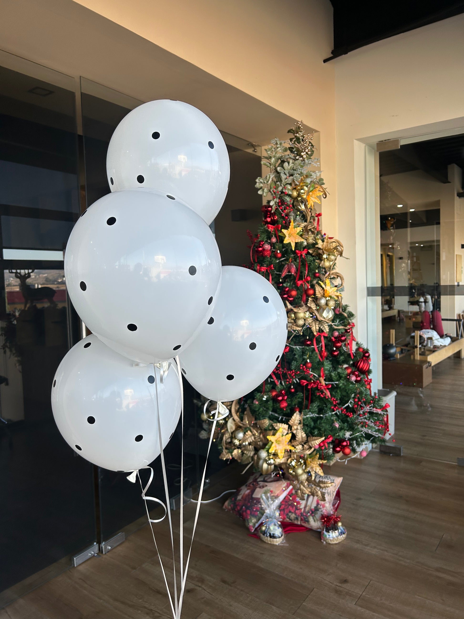 - 4 globos látex + stickers de lunares. Favor de especificar en las indicaciones especiales el color del globo de látex 24" y el texto de su elección.