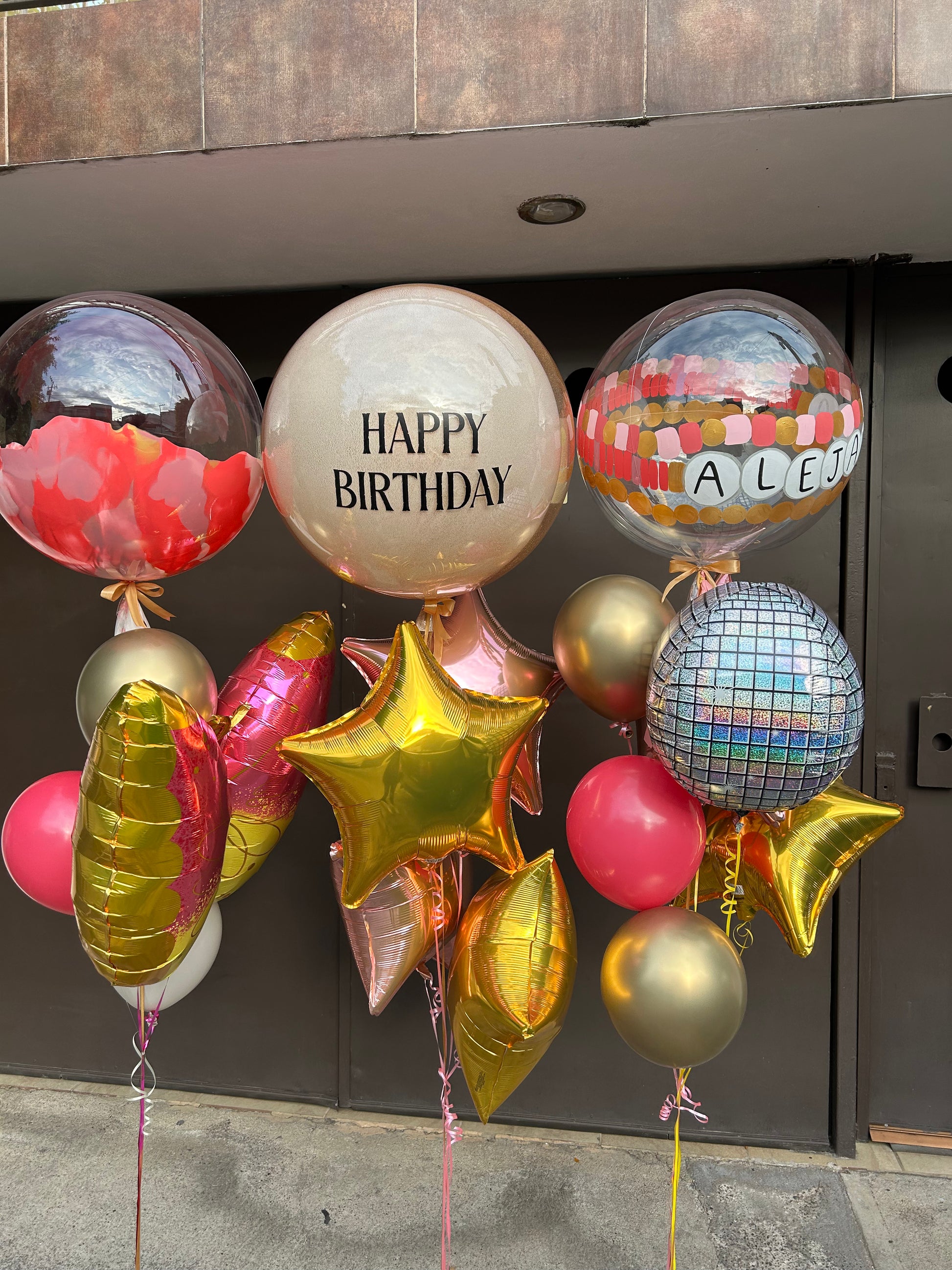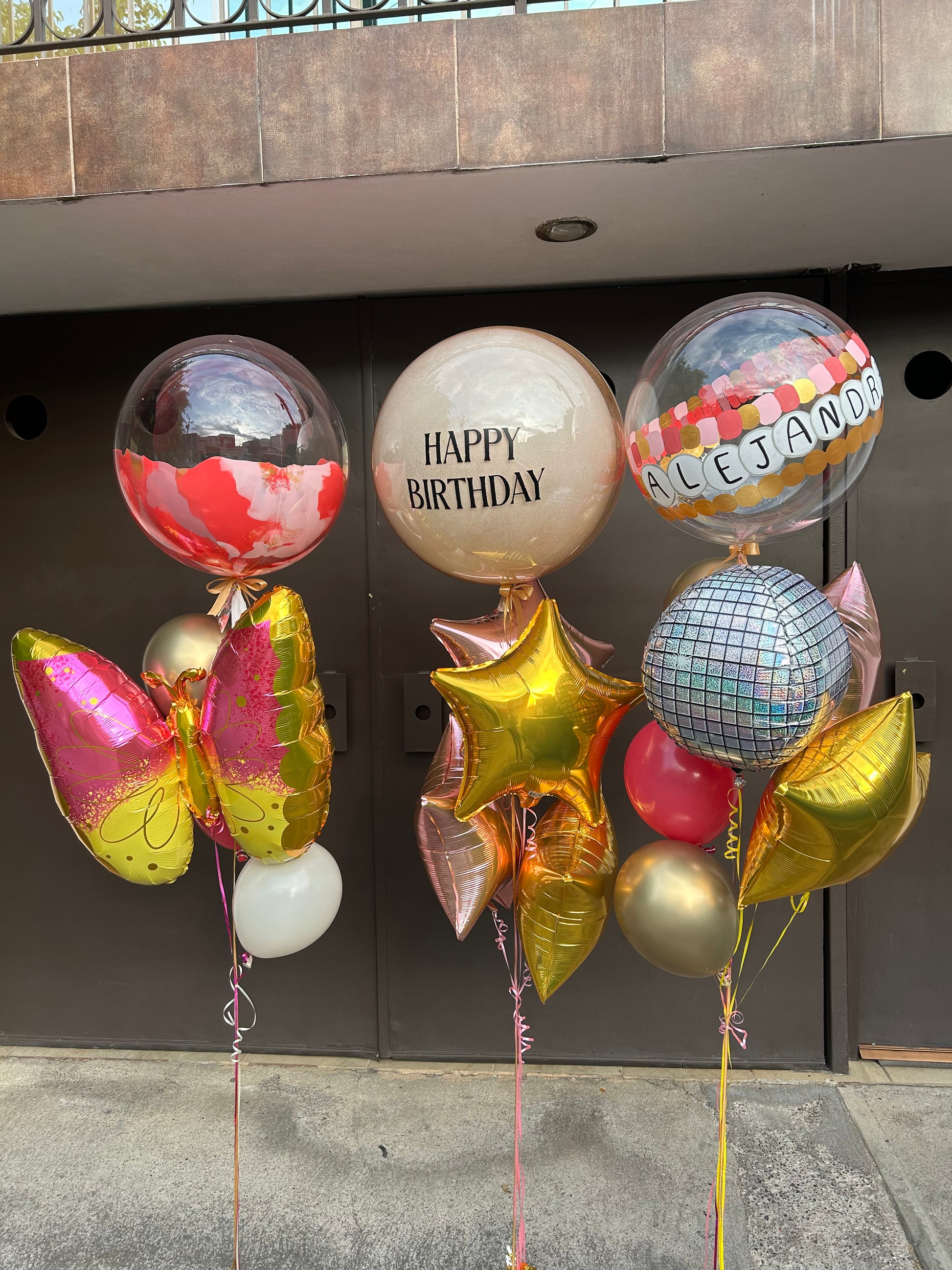 - 1 Globo burbuja grande transparente con globo látex 24" + 1 globo burbuja mediano marmoleado + 1 globo burbuja mediano con friendship bracalet + 1 orbz disco + 1 mariposa rose gold + 6 estrellas metálicas + 5 globo látex 12". Favor de especificar en las indicaciones especiales el texto de su elección.