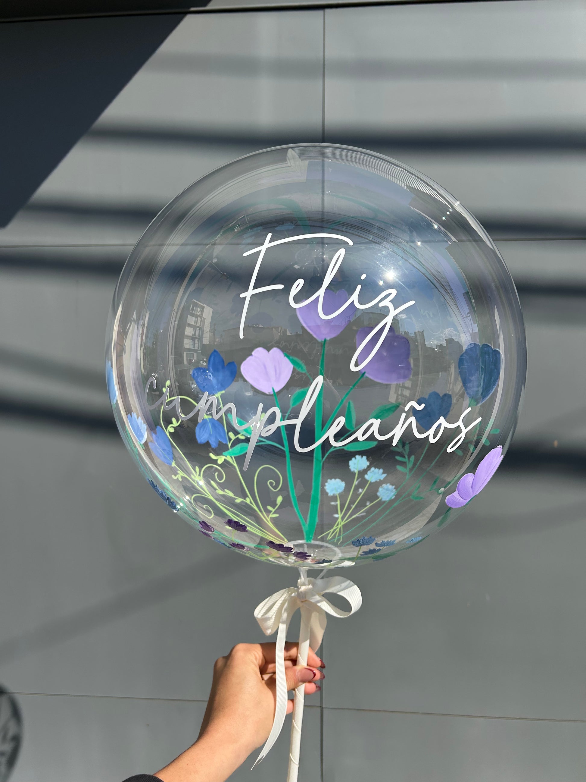 - Globo burbuja transparente pintado por fuera con flores variadas en tonos azules/morados. Favor de especificar en las indicaciones especiales el texto de su elección.