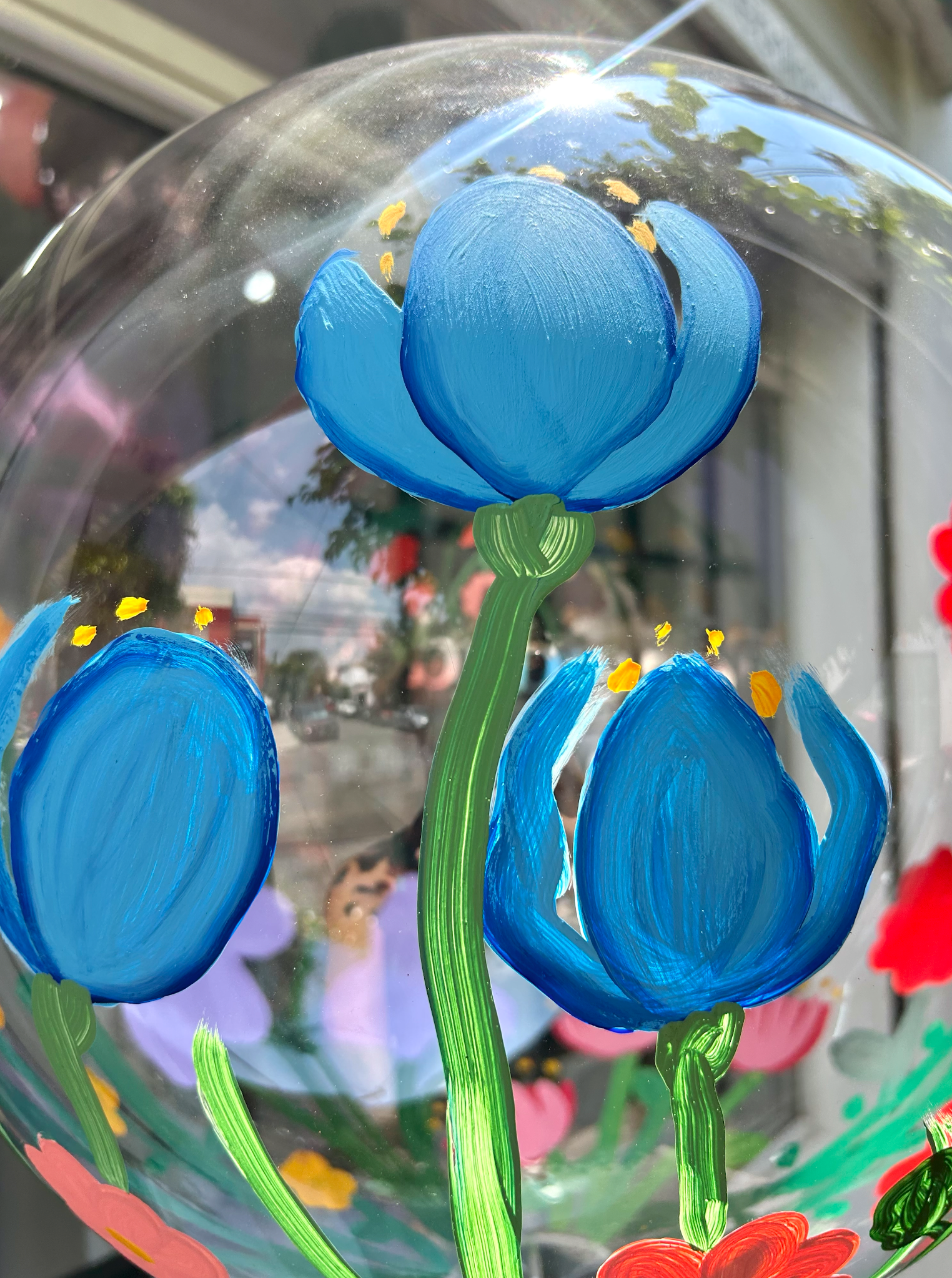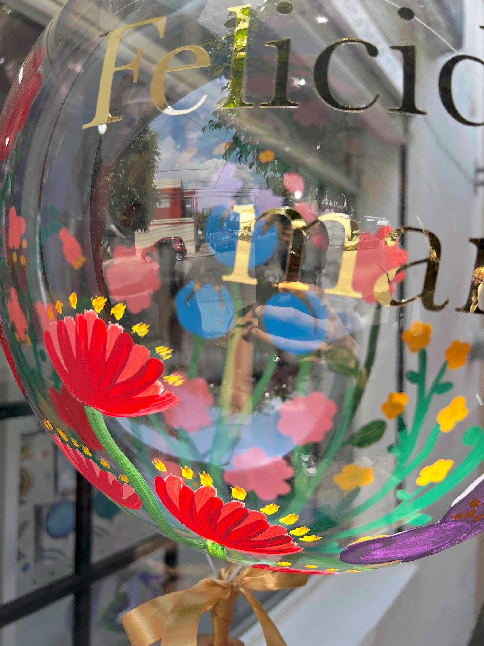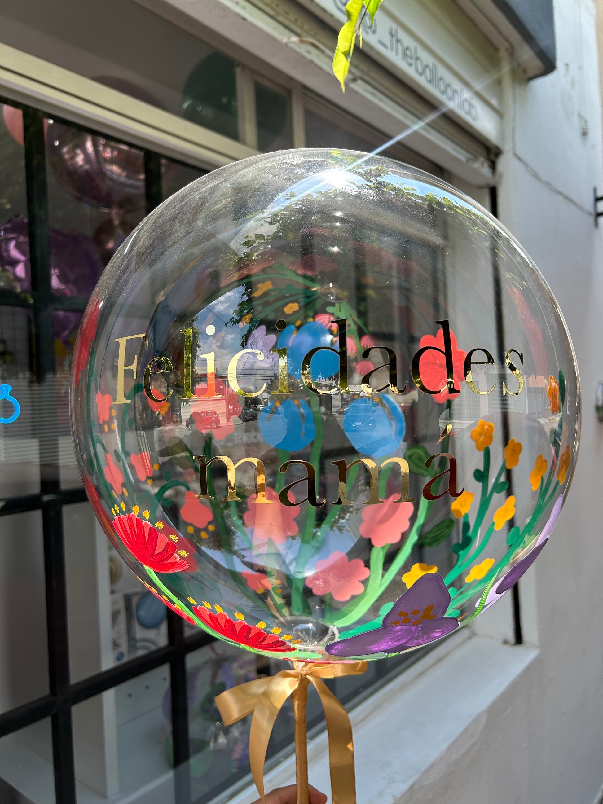- Globo burbuja transparente pintado por fuera con flores variadas. Favor de especificar en las indicaciones especiales la gama de color y el texto de su elección.
