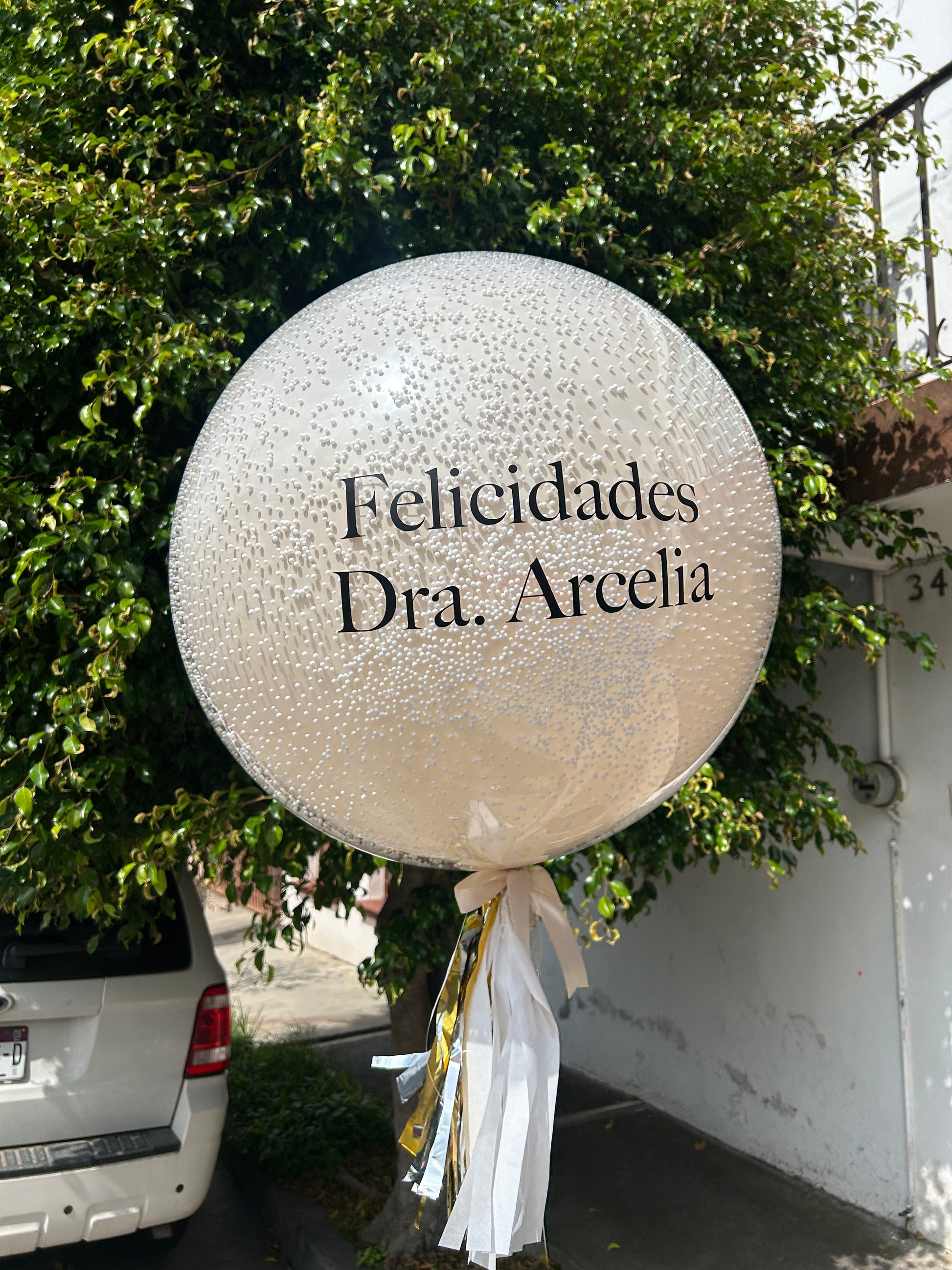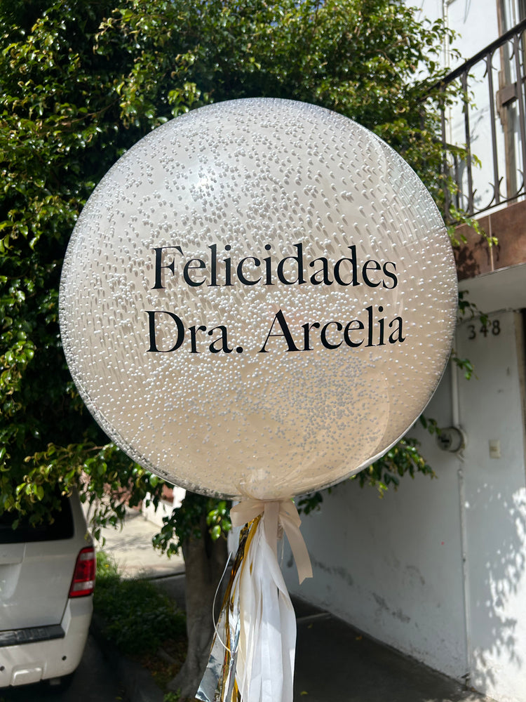 - Globo burbuja transparente con globo látex 24" + bolitas blancas de unicel. Favor de especificar en las indicaciones especiales el color del globo látex y el texto de su elección.