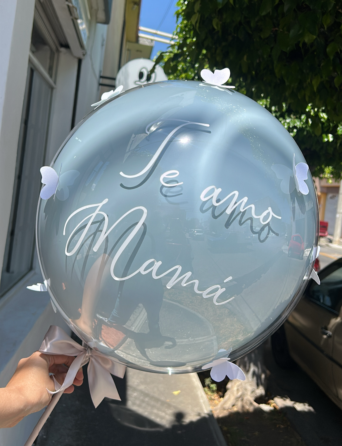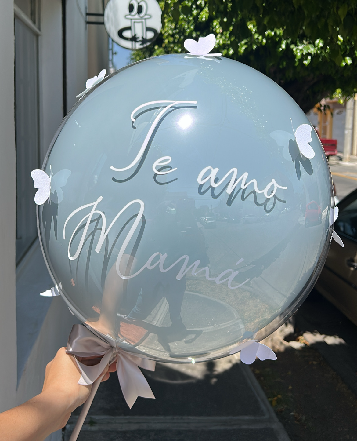 - Globo burbuja transparente con globo de látex 24" + mariposas de papel especial. Favor de especificar en las indicaciones especiales el color del globo de látex 24" y el texto deseado.