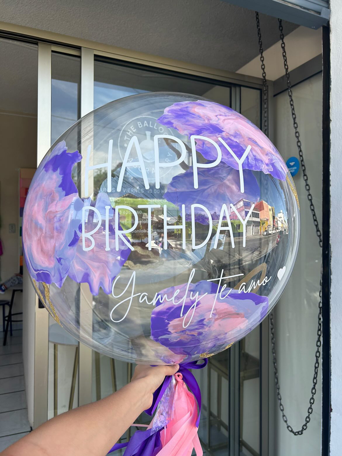 - Globo burbuja con flores marmoleadas por dentro. Favor de especificar en las indicaciones especiales los colores y el texto de su elección.