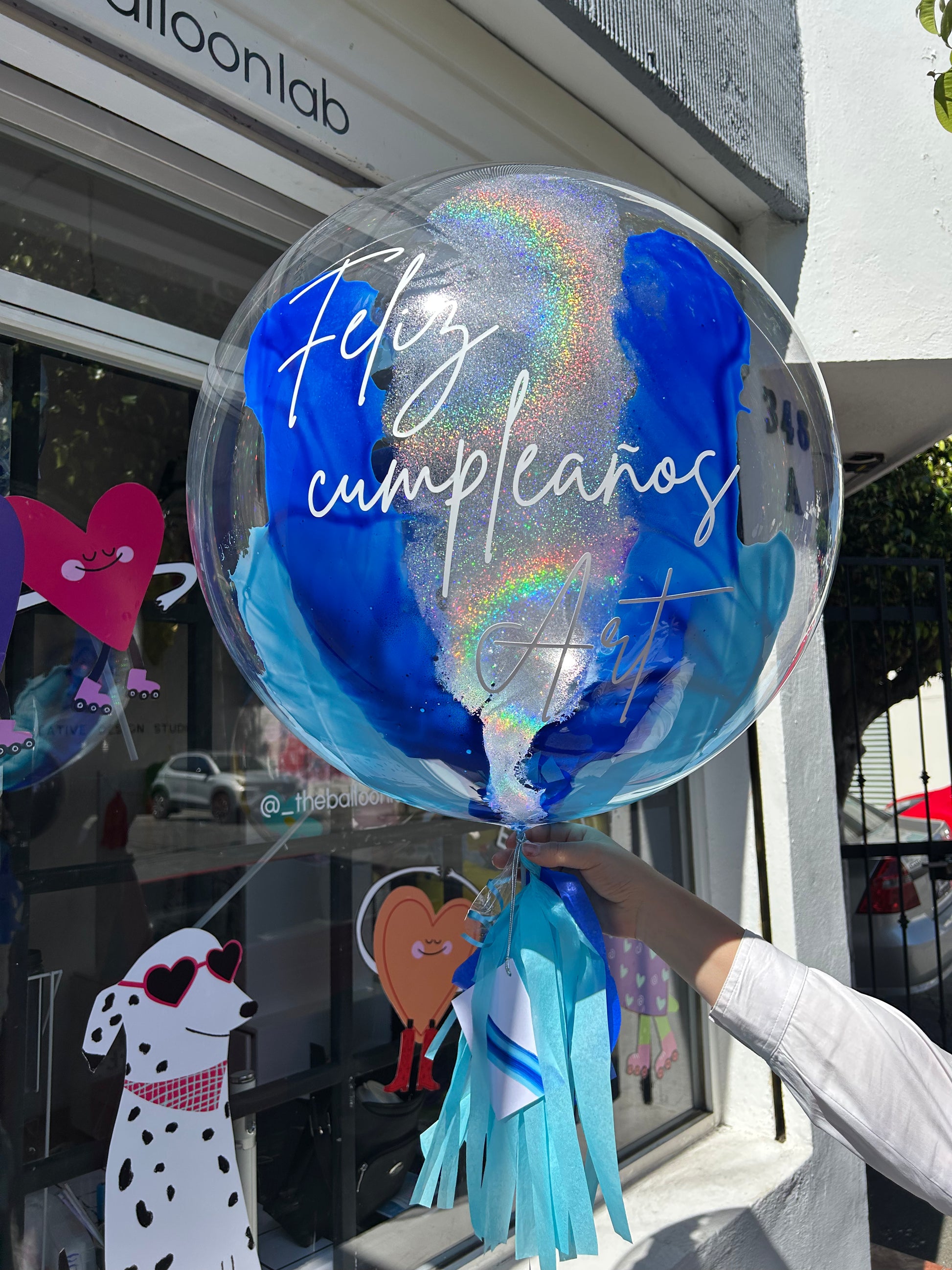 - Globo burbuja transparente pintado con degradados de color y brillantina. Favor de especificar en las indicaciones especiales la gama de color y el texto de su elección.