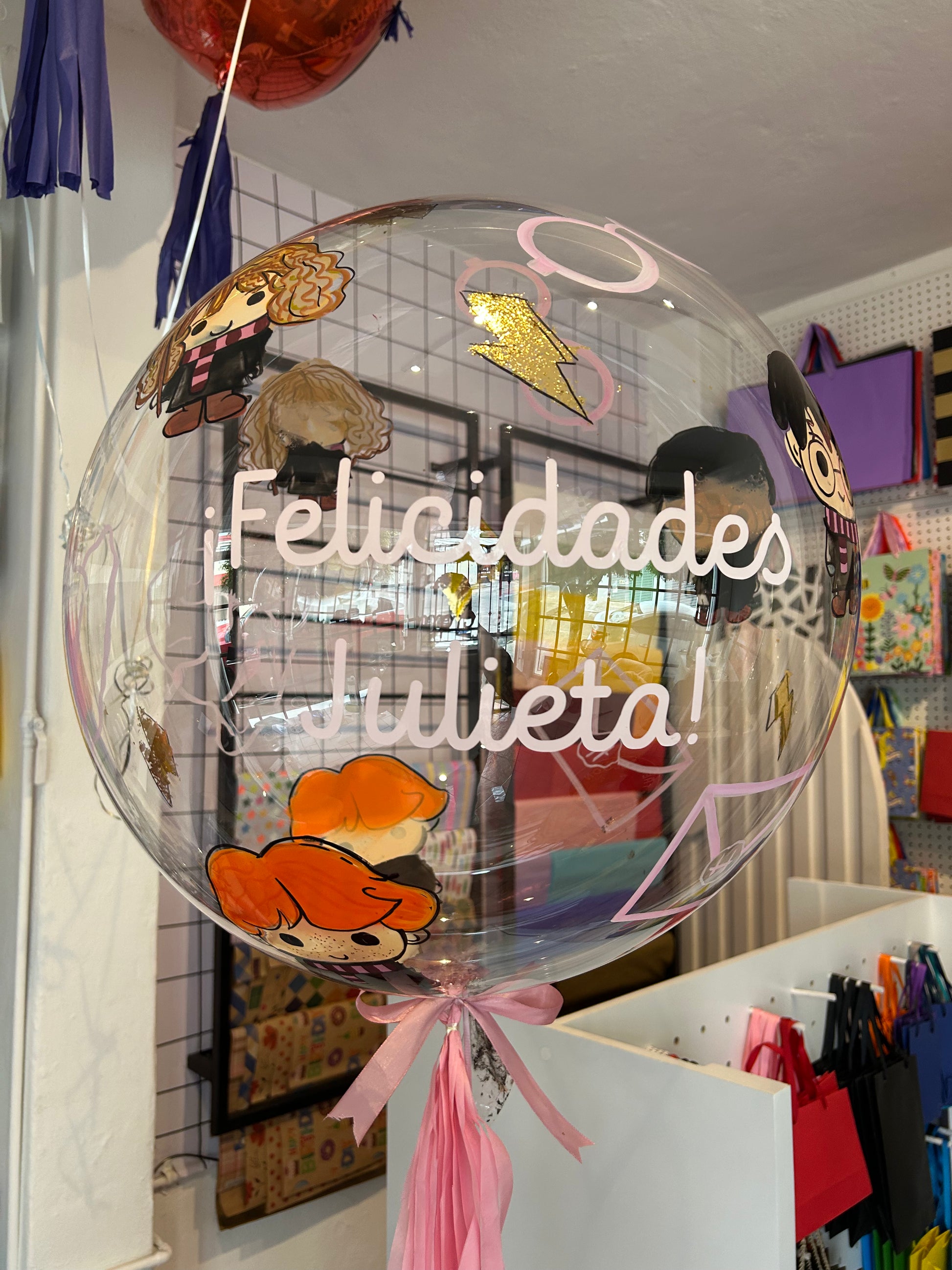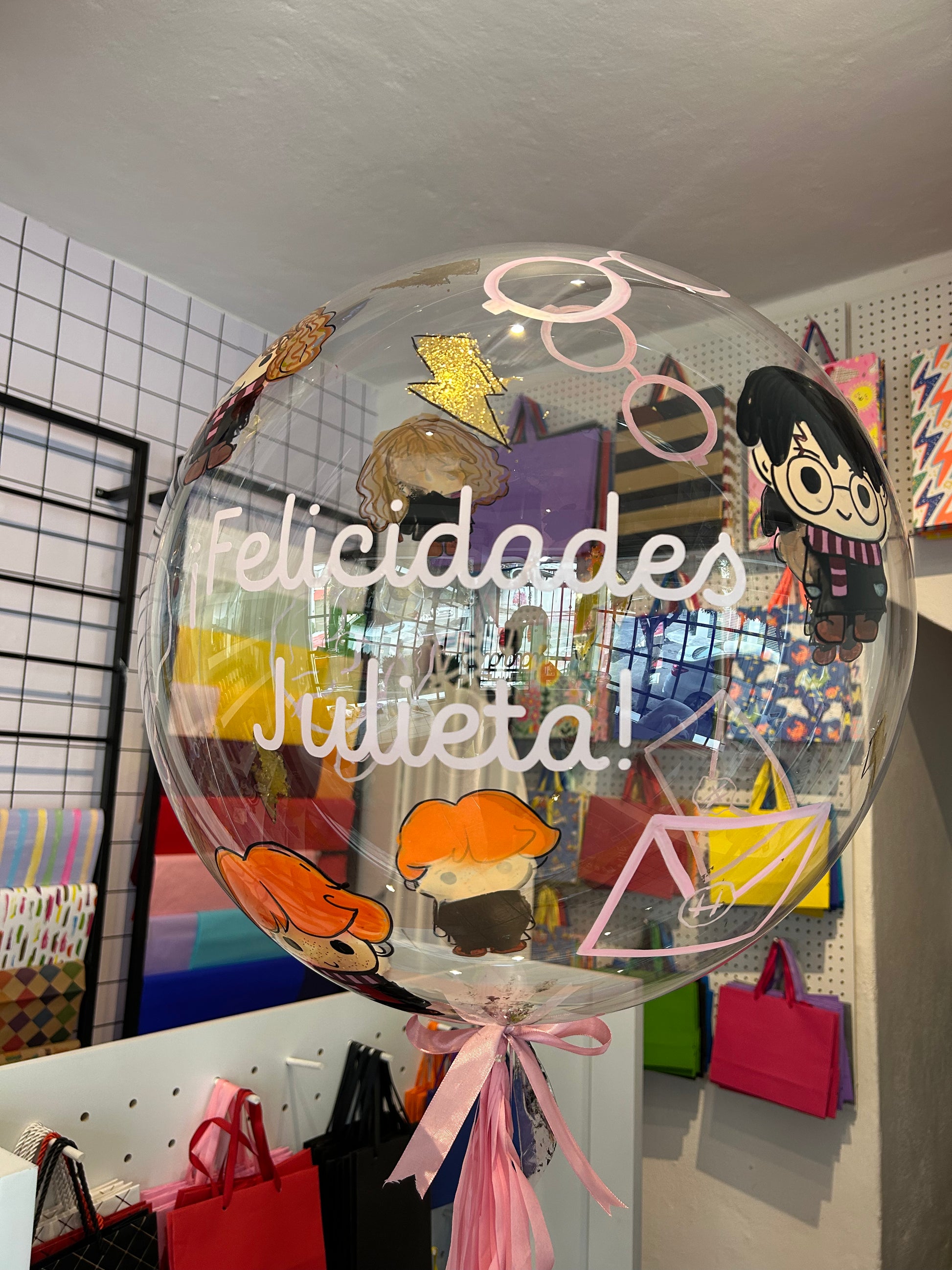 - Globo burbuja transparente pintado por dentro y fuera con figuras de Harry Potter infantil. Favor de especificar en las indicaciones especiales el texto de su elección.