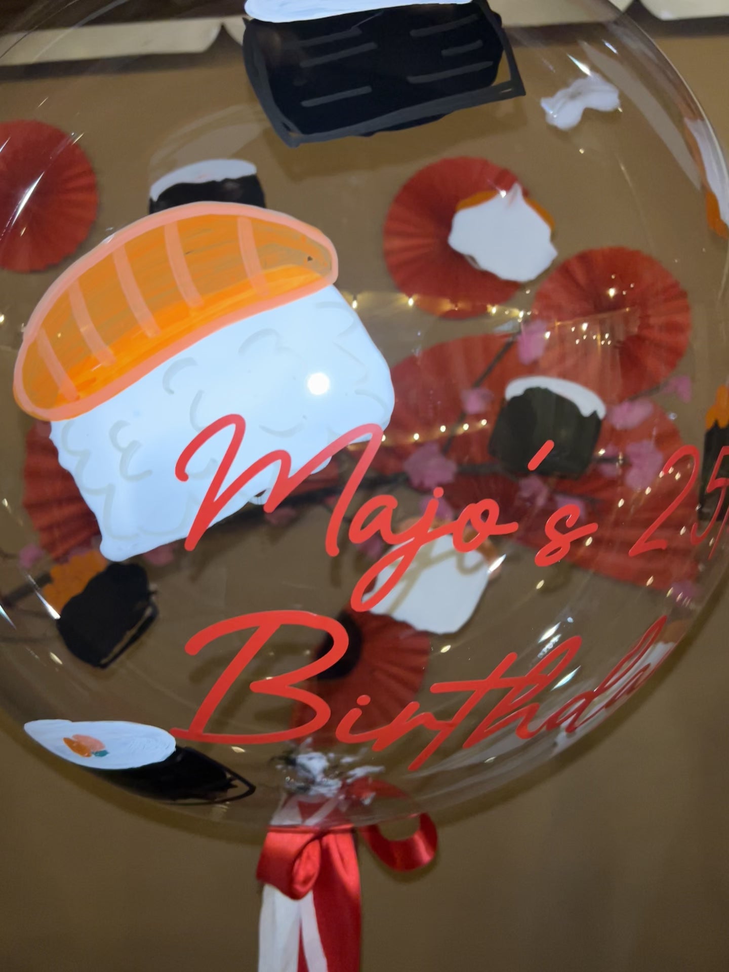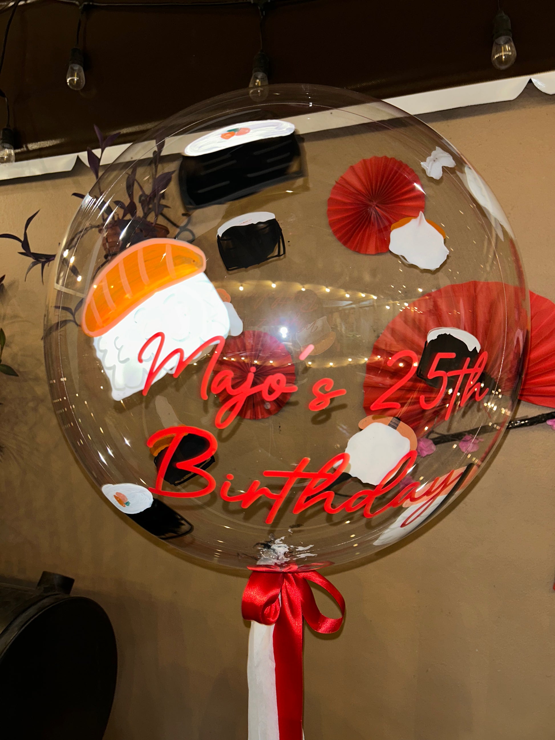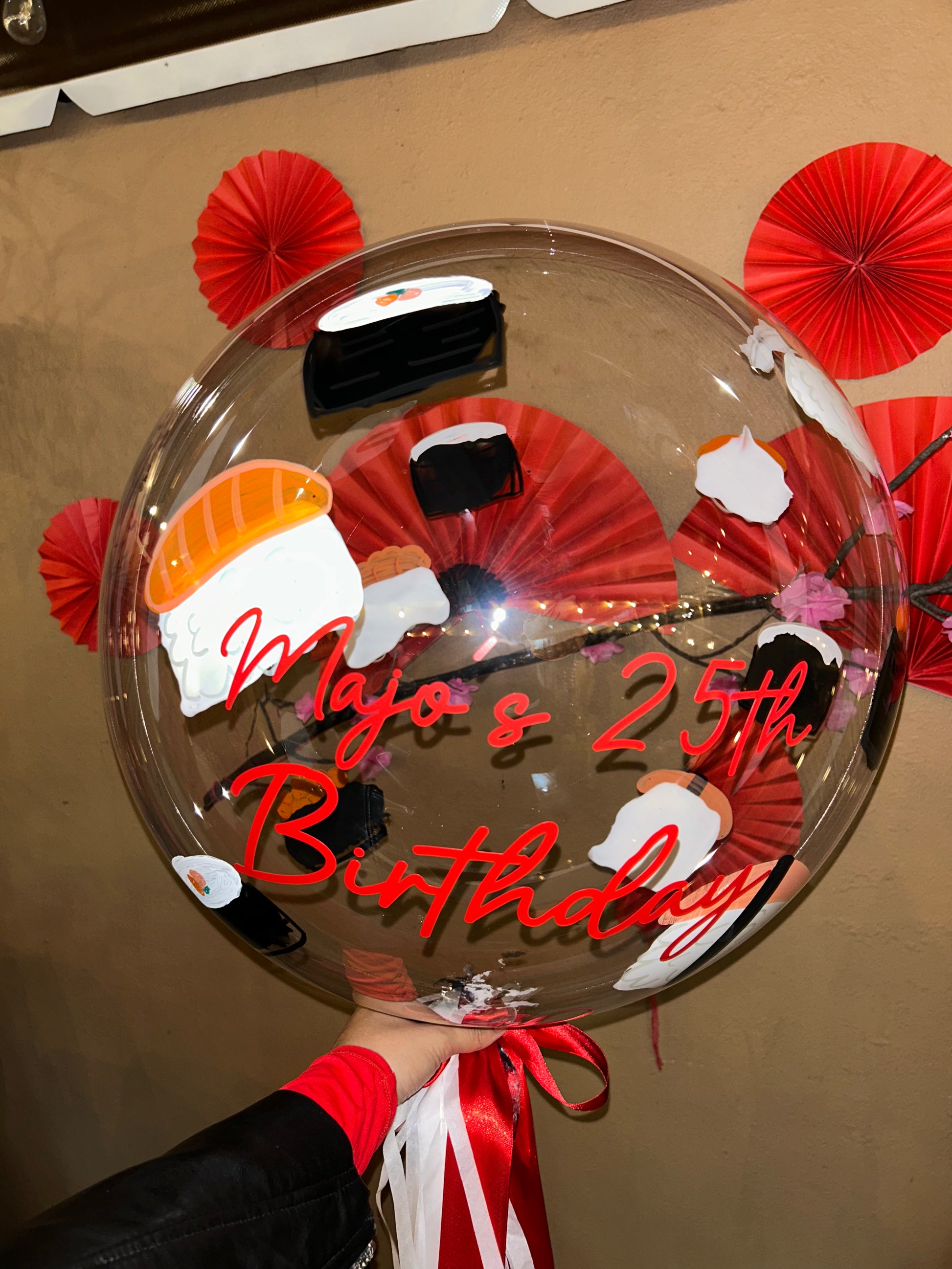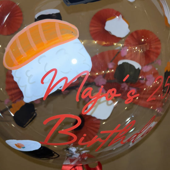 - Globo burbuja transparente pintado por dentro y fuera con variedad de sushi. Favor de especificar en las indicaciones especiales la gama de color y texto de su elección.