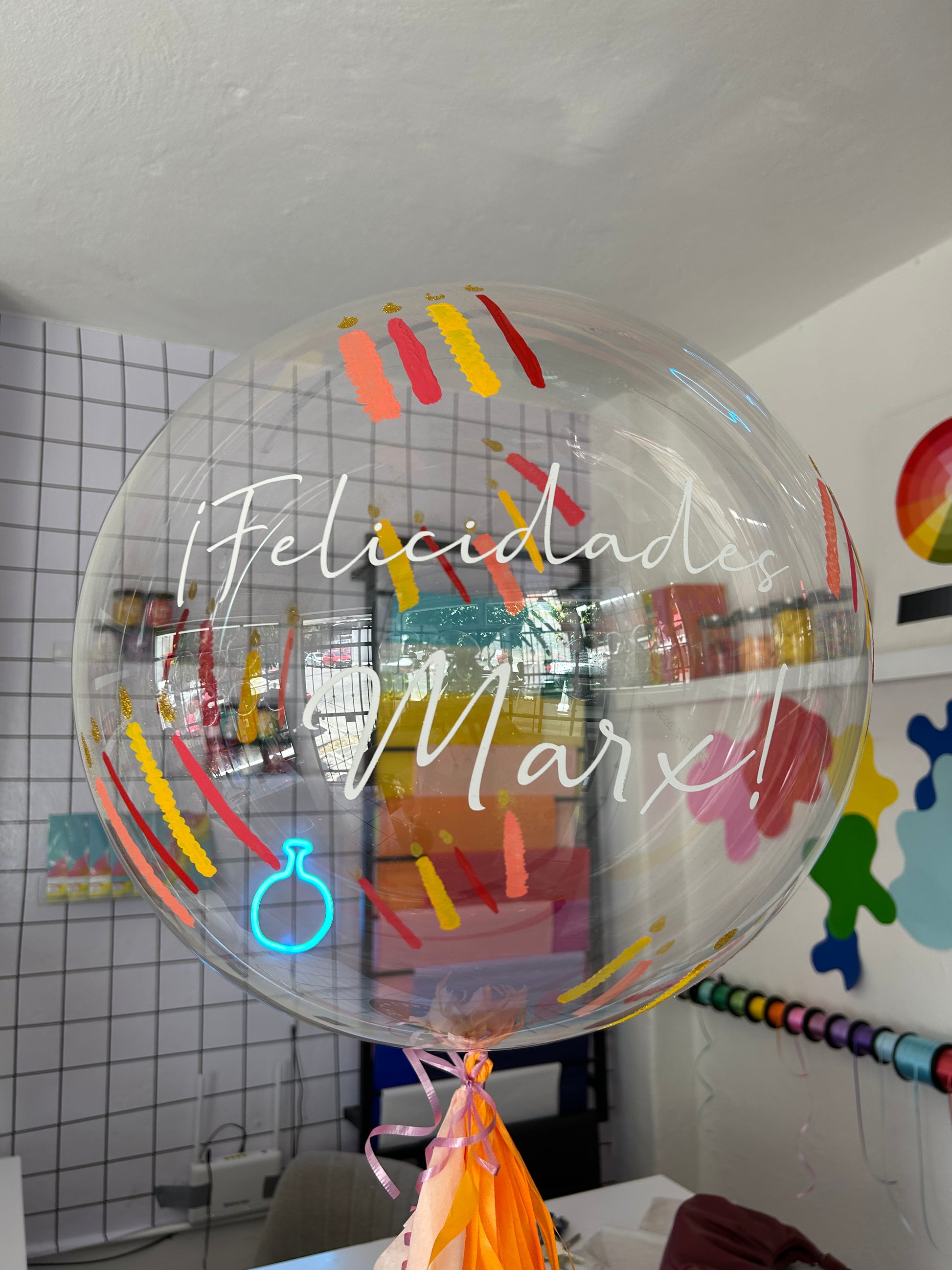 - Globo burbuja transparente velitas pintadas por fuera. Favor de especificar en las indicaciones especiales el color de las velitas y el texto de su elección.